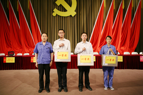 最終經(jīng)過激烈角逐,一分廠黨支部代表隊以其扎實的理論功底獲得一等獎,滿莊分公司黨支部代表隊通過微小品《開黨會》贏得滿堂喝彩,與機關(guān)二黨支部獲得二等獎,鄒城公司黨委、機關(guān)銷售黨支部、短切氈車間黨支部獲得三等獎。